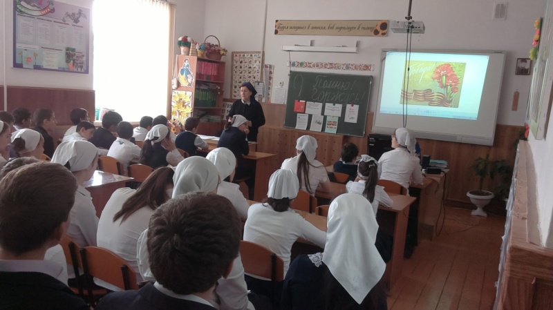 05.05.2017г. в МБОУ «Коррекционная школа» г. Грозного согласно плану прошло мероприятие, приуроченное 72-й годовщине Победы советского народа в Великой Отечественной войне. Учитель истории Чакаева Л.Х. рассказала учащимся о трудностях военных лет .Ученики посмотрели видеоматериал «Никто не забыт, ничто не забыто!»Завершилось мероприятие минутой молчания – как дань памяти погибшим.
