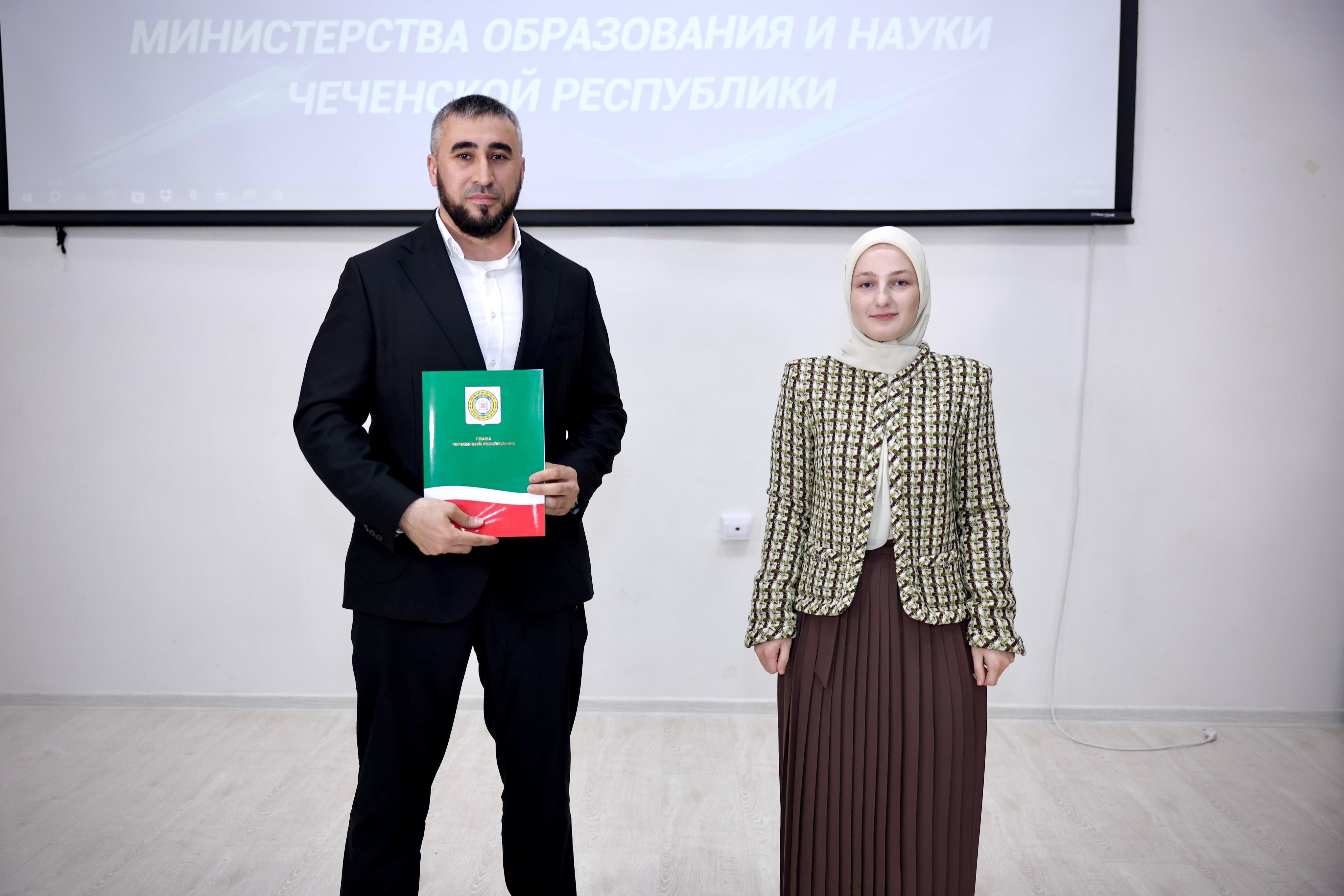 Первый заместитель Руководителя Администрации Главы и Правительства ЧР по взаимодействию с социальным блоком Хадижат Рамзановна Кадырова вручила заместителю Мэра - начальнику Департамента образования Мэрии г. Грозного Зелимхану Ахматову благодарственное письмо Главы ЧР, Героя России Рамзана Ахматовича Кадырова «За заслуги в развитии национальной культуры, вклад в сохранение чеченского языка, безупречную добросовестную работу и в связи с Днем чеченского языка».